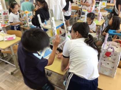 3組から楽しそうな声が聞こえてきました。どうやらコロコロガーレが完成し、みんなで見合ったり、遊び合ったりしているようです。自分が想像したようにビー玉が動くか確かめながら、みんなで楽しんでいました。