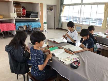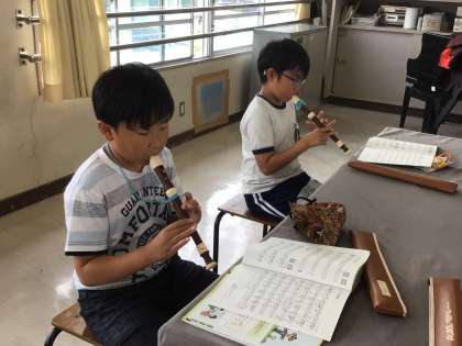音楽の時間をのぞくと、リコーダーの練習中でした。シのフラットを練習したり、「小さな世界」を演奏しました。息の量に苦戦しながらも一生懸命演奏していました。