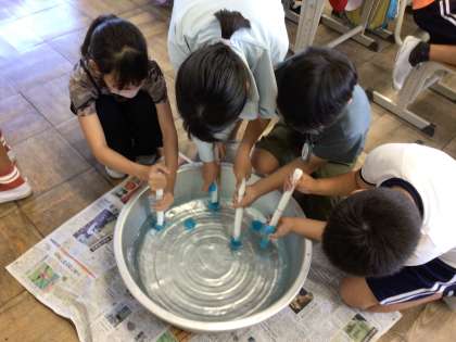 授業のご参観ありがとうございました。2日目は空気ではなく水に力を加えて様子を確かめました。前回の空気とは違い、全く縮まない様子に驚きながらも、空気との違いを正しく理解することができました。