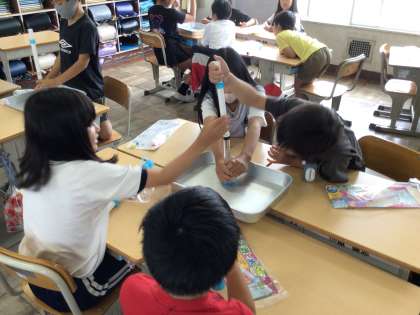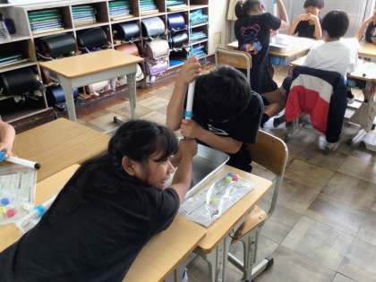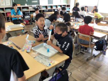 2組からうなり声が聞こえると思ったら、一生懸命水に力を加えていました。中には顔を真っ赤にさせてピストンを押し込んでいる子もいました。空気との違いが分かったか、ご家庭で話題にしてみて下さい。