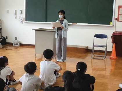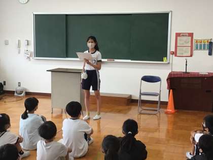 今日は学年集会でその意見発表を学年の前で行いました。集会の最後に、思い切って発表できるよう学年全員で2人にエールを送りました。