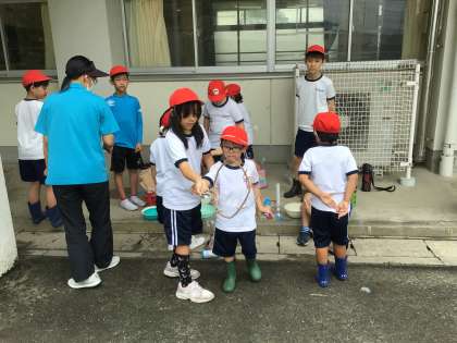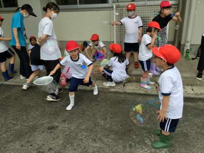 みんなでいろいろな道具を使ってシャボン玉を作りました。