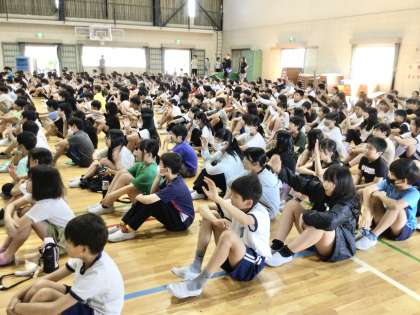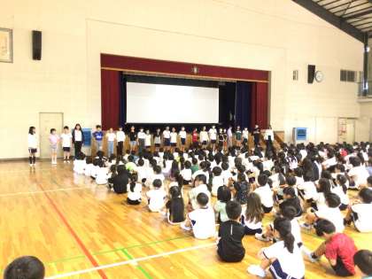 にじいろ集会で、ボランティア委員会から小清水にいる生き物の紹介がありました。うさぎのクローバーや、鯉のコッペパンとコイキングなどが紹介され、特徴や注意が伝えられました。