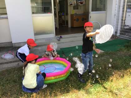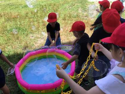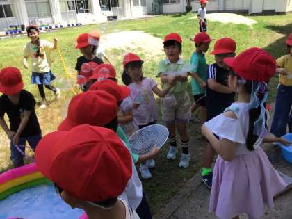 1年生が進化したシャボン玉遊びをしているところに出会いました。