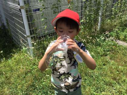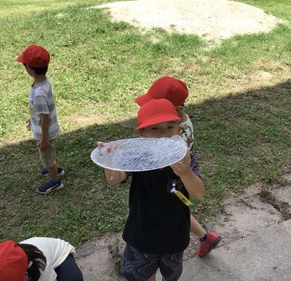 いろんな道具を使ったり、友だちと協力したりして、シャボン玉遊びを楽しみました。