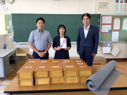 (株)山豊工建様と十六銀行様から跳び箱とロイター板の間に入れて使用する距離調節器と、マットが滑らないようにするためのストップシートを寄付していただきました。