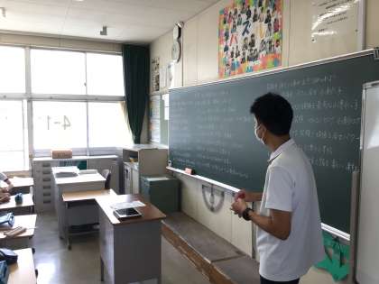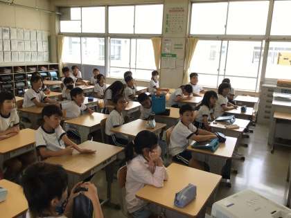 1組では運動会のテーマについて考えていました。黒板にびっしり書かれた候補から、みんなで一つに絞り込みます。自分の考えたテーマがクラス代表になるかワクワクしている様子が見られました。