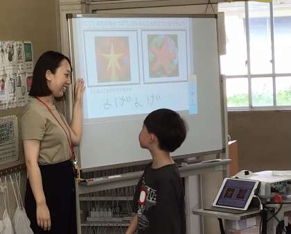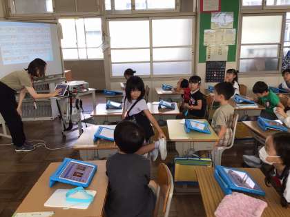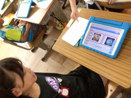 1年生のクラスの前を通ったとき一生懸命何かをやっている子どもの姿が目に入りました。教室をのぞいてみると、図工の時間でした。たぶん、鑑賞をしているのだと思いました。