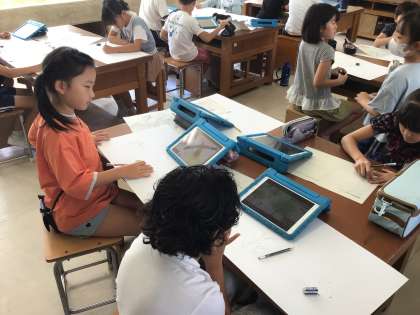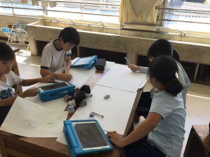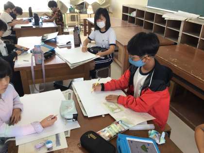 読書感想画では、画用紙に下書きしたり、絵の具で色を塗り始めたりする子が出てきました。同じ話を聞いたのに、色々な世界が描かれており、完成が楽しみです!