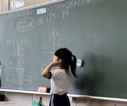 筆算のちがいをつかって、計算の仕方を説明していました。
