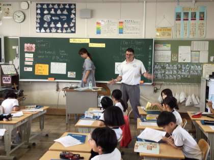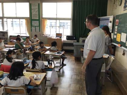 4組から楽しそうな音楽が聞こえてきました。英語の歌を歌いながら様々な国の名前を覚えていました。前で歌いながら踊るカイル先生がとてもチャーミングです。