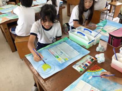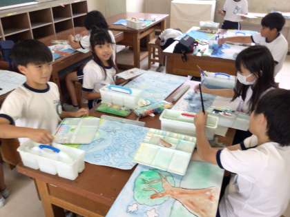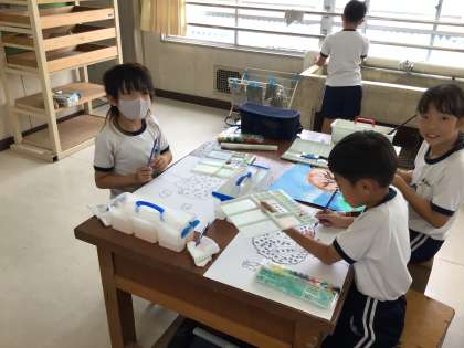 1組が読書感想画を進めていました。背景を薄めに色付けし、濃い色をのせることで立体的に表現していました。絵の具の使い方がレベルアップしているのが分かります。完成をお楽しみに!