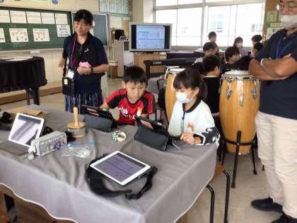 自分たちで考えた組み合わせの音楽が、どんな感じになるのか何度でも確かめられるところがアプリを使う良さです。この後、自分たちで楽器を使って演奏する予定です。