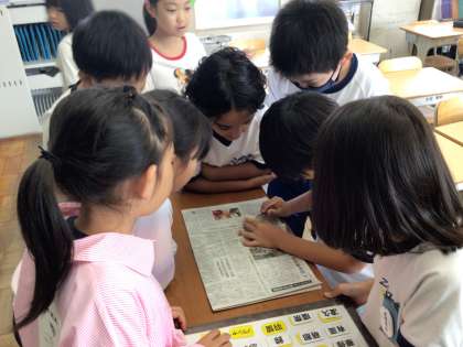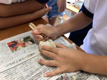 4組では、ただいま発掘ブーム到来中です。担任が持ってきた石から何が出てくるか、協力して掘り出しています。珍しい体験からか、順番待ちが発生しています。