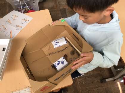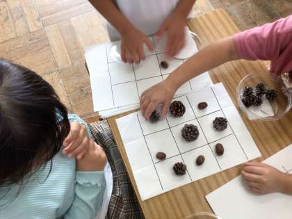 今日は秋晴れ。1年生の教室をのぞくと秋遊びをしていました。