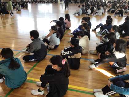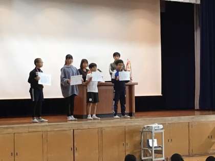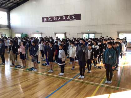 運動会が終わり、整列も上手になってきました。寒さを感じる中ですが、元気な挨拶とともに、にじいろ集会が始まりました。今日は夏休みに頑張った科学研究の表彰が行われ、友達の頑張りを大きな拍手で讃える姿が見られました。