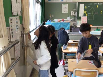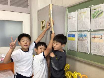 算数で、三角形四角形 の学習をしています。今日は、直角を習いました。教室の中には、直角があるかな?