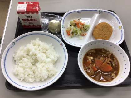 今日は愛知県民の日献立でした。 豊田産じゃがいもコロッケ、豊田ひまわりポークの赤だし、鬼まんじゅうです。