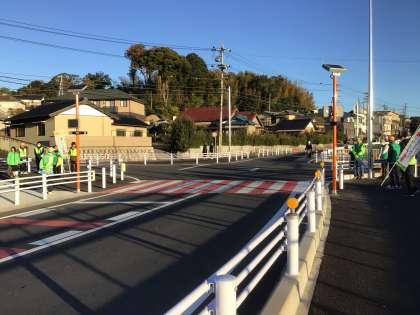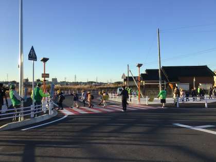 12月10日(火)天王町2丁目地内の横断歩道に、押しボタン式横断者明示標識「ぴかっとわたるくん」が設置されました。朝、地域の方やバイパス事業の方、警察署の方など多くの方々に見守られながら子供たちはボタンを押して横断しました。