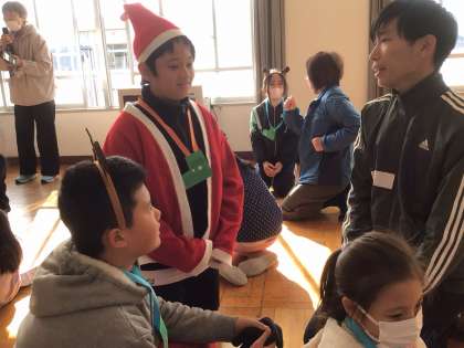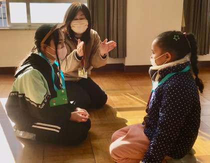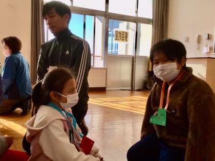 自己紹介げーむでは、音楽に合わせてペアを作り、母国語や英語、日本語などいろいろな国の言葉で名前などを伝え合いました。