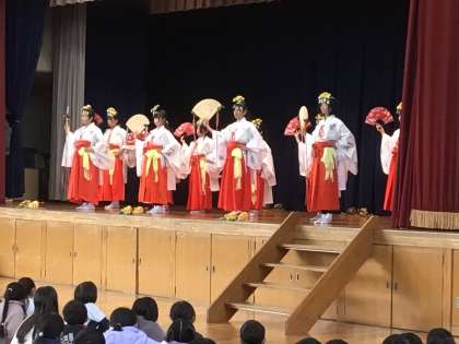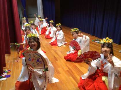 巫女舞も、この地区ならではのクラブです。練習時間が短いですが、きれいに踊ることができました。舞台の中では、ちょっと緊張していたかもしれませんがよい笑顔でした。
