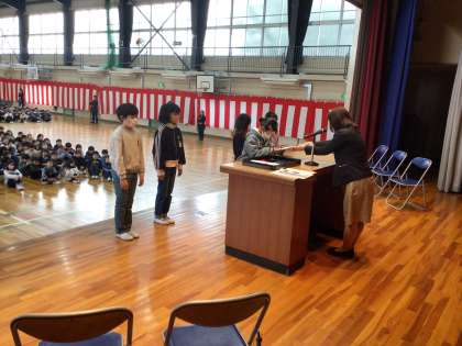 1時間目に修了式を行いました。はじめに代表児童による、1年のふりかえりを行いました。1年間で成長したこと、印象に残った思い出、新学期への思いなどそれぞれの児童が感じたことを堂々とステージ上で話していました。次に、修了証(通知表)の授与を行いました。1年間で学んだことを胸に4月からも元気いっぱい、やる気いっぱいの小清水っ子に会えることを楽しみにしています。