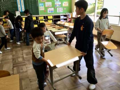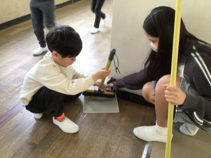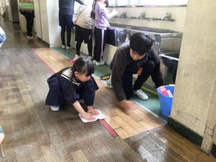 今週から掃除が始まりました。やり方の分からない1年生に、6年生が一生懸命に教えてくれています。そのおかげで、少しずつやり方を覚えてきました。6年生、ありがとう😊