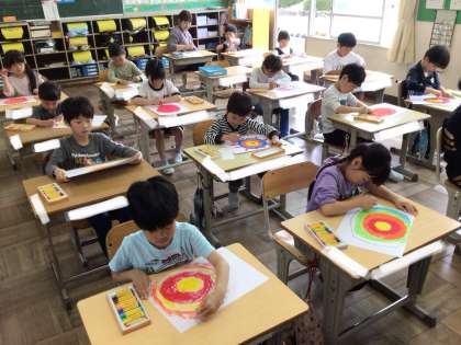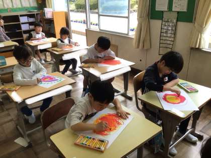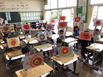 初めての図工の授業で、「わたしのたいよう」を描きました。