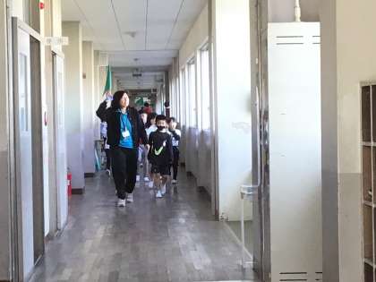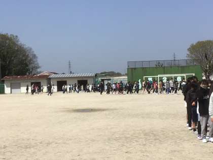 新しい教室になったので、避難経路を覚えることがねらいです。