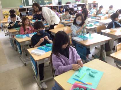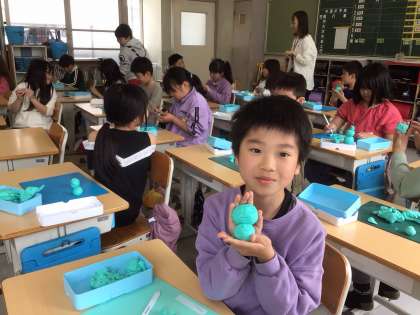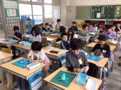 教室を回っていたら、楽しそうに粘土で作品を作っているクラスがありました。
