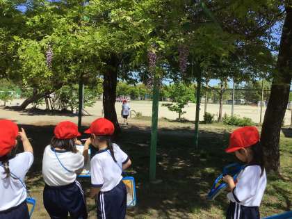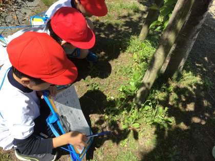 生活科の学習で春見つけの学習をしました。耳を澄ませて鳥の鳴き声を聞いたり、目を使って花や虫をじっくり観察したりして、春をたくさん見つけました。