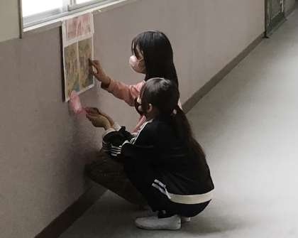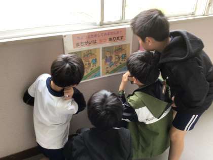 校長室前にまちがいさがしコーナーを作っています。