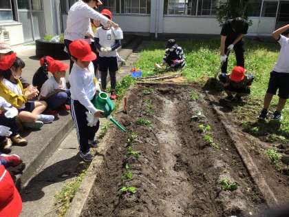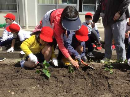 みんな一生懸命スコップを使って穴を掘ったり、苗をねかせたりして植えていました。
