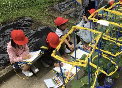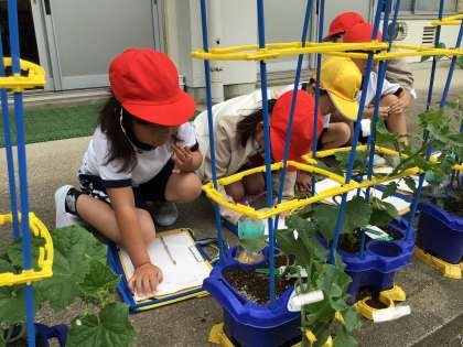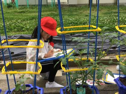 野菜の観察をしました。前回の観察から2週間が経ち,野菜も大きく成長しました。国語の学習で学んだ観察カードを上手に書くひみつを手がかりにして,自分の体と比べて高さを表したり葉や実の形を別のものにたとえたりして,様子が伝わるように観察カードを書いていました。早くも実ができている子も見られ,子どもたちもうれしそうに観察していました。