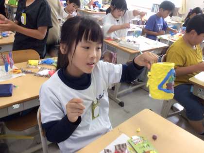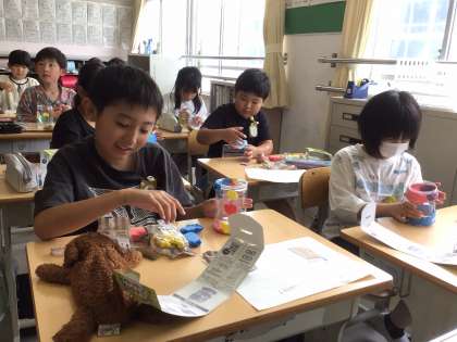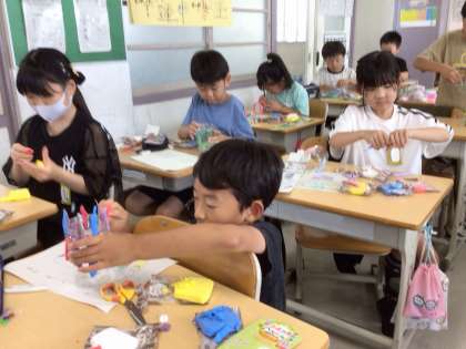 ふと立ち寄ってみたら、図工の時間でした。カラフルな紙粘土を混ぜたり、形に整えたりしながらがんばって作っていました。