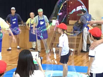 体育館に戻ったら、たまたますてきなこんなジャンボシャボン玉の様子が見られました。