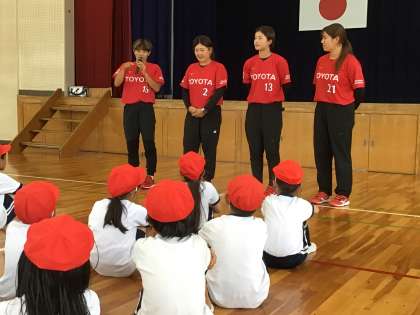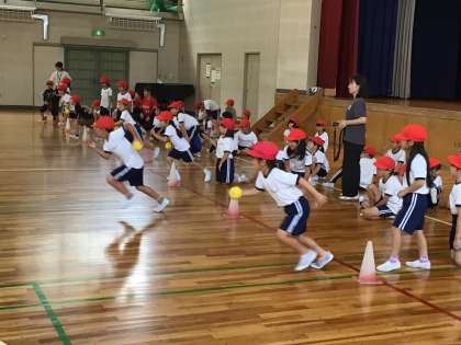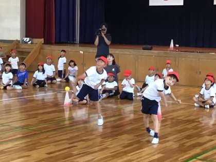 トヨタレッドテリアーズの選手,4名を講師に投げ方教室を行いました。ウォーミングアップとして,ジャンボリミッキーを踊り,チーム対抗のリレーも行いました。その後,選手からボールを遠くへ投げるコツを教わりました。教わる前より遠くへ飛ばすことができた子が多くいました。有意義な時間となりました。