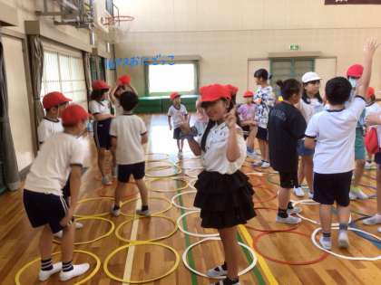 体育館も使って体を動かします。今日は、黄色グループが体育館で遊びました。
