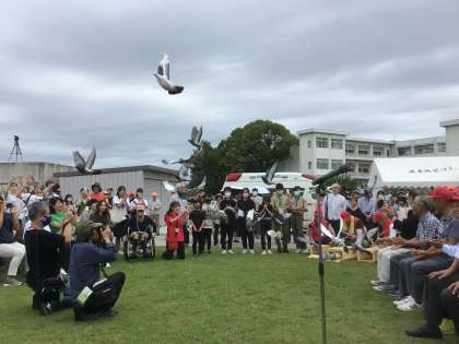 勢いよく鳩が飛び出しまし、空に彼方まで飛んでいきました。