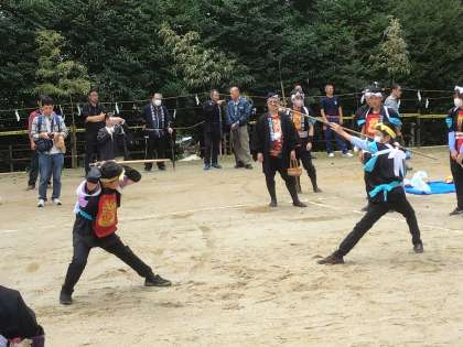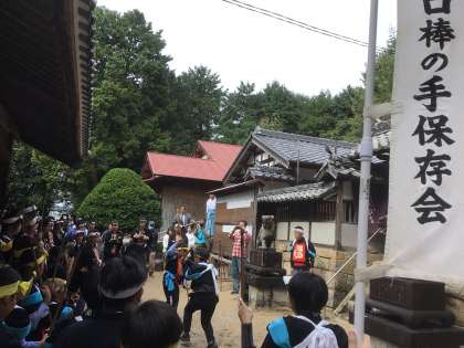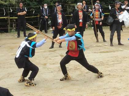 雨のため、各地区で披露することになったようです。宮口神社では、棒の手クラブの子たちも含めて力強く演技をしていました。