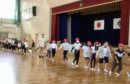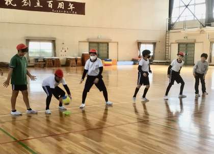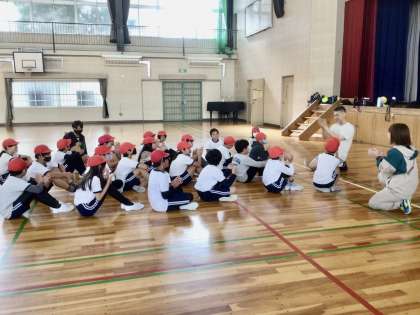 体育館では、ボールを回すゲームを通して、仲間と工夫したり力を合わせたりする経験をしました。