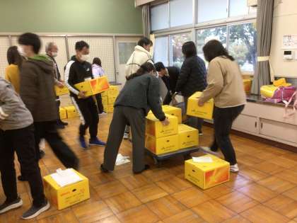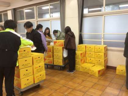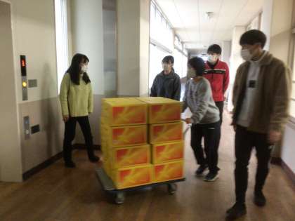 毎年、和歌山県田辺市のJA紀南から美味しいみかんが届きます。これは、届いたみかんを学年ごとに配付するため運搬している様子です。こんなにたくさんのみかん、しかも甘くておいしいみかんを送ってくださるJAの方に感謝しつつ、家族でみかんの話題で盛り上がっていただけると嬉しいです。