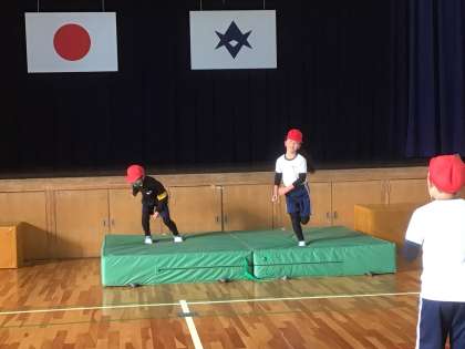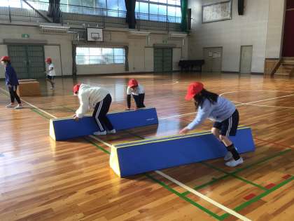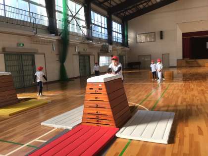 3年生が、体育館で跳び箱の授業をしていました。いろいろな高さの跳び箱や、マットなどが準備されていて、練習量が確保されていました。そして、自分が挑戦したいと思う列に並んで、どんどん跳んでいました。初めて成功し、やったーという声や思わず笑顔になる場面を見ました。