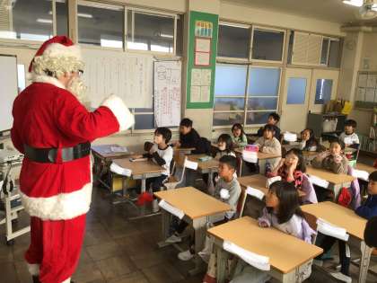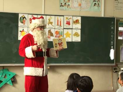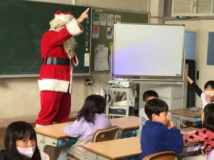 2年生のクラスに、サンタクロースに仮装したALTがやってきました。クリスマスに関係する言葉を英語でたくさん教わりました。紙芝居に描かれた絵を見て英語で答えるクイズもありました。楽しみながら英語を話していました。