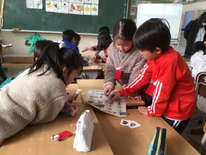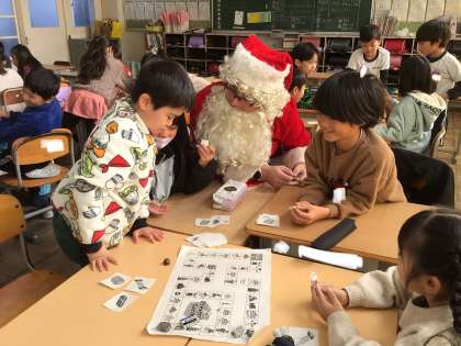 クリスマスすごろくの様子です。止まったマスの言葉を英語で発音しながらゴールを目指しました。