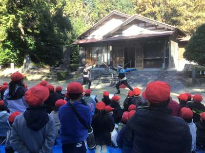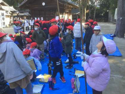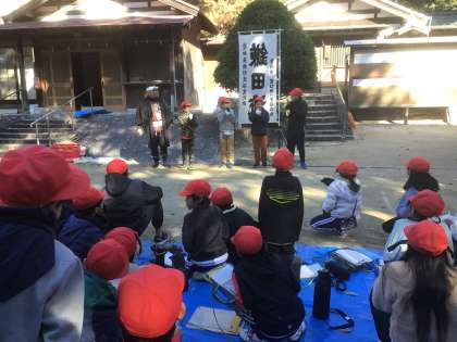 12月12日金曜日、宮口神社へ行き巫女舞と棒の手の見学をしました。なぜ、巫女舞や棒の手を行うようになったのか宮口神社の歴史を聞いたり、ホラ貝をふくなどいろいろな体験を通して学びました。
