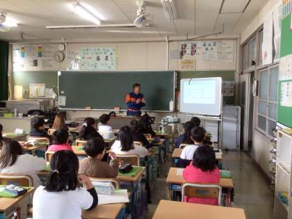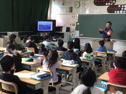 3年生社会科「くらしを守る」の学習で地域消防団の取り組みについて学ぶ時間がありました。本校職員が消防団に所属していることから制服を着て授業を行いました。実際の活動の写真とともに話を聞くことができました。