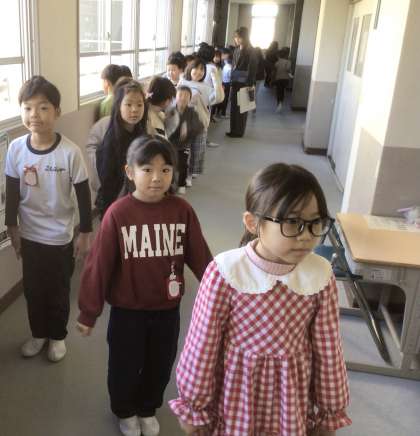 今日は2年生を表彰しました。廊下に表彰してもらう児童がたくさん並んでいました。