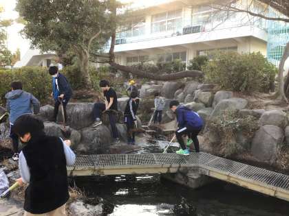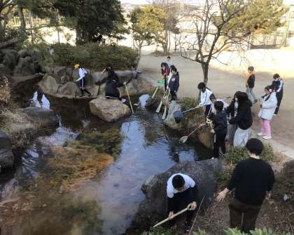 池に沈んでいる落ち葉などを一生懸命すくってきれいにしていました。