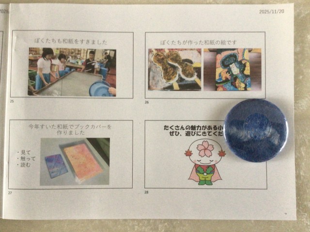 総合の学習で小原和紙について学んだそうです。そして、今日は、自分たちで作ったパンフレットや和紙の缶バッジなどと一緒に博物館を訪れる人に小原地区の魅力を紹介したいと出かけてきたそうです。自分たちで和紙をすいて作品を作るのはすてきだなと感じました。県外の人にもよさが伝わるといいなあと思っているそうですよ。